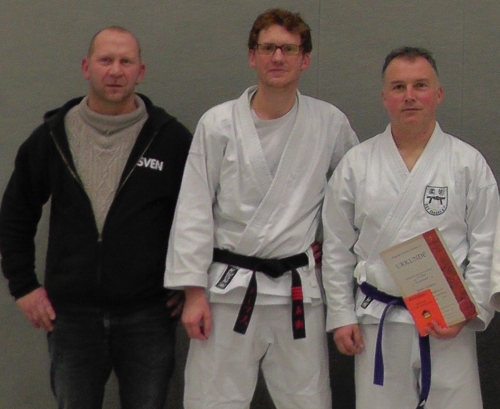 | 7. Dezember 2013 | Bei der Landesprüfung in Wanzleben bestand Heiko Gleißert erfolgreich die Prüfung zum 1. Kyu (Braungurt). Trainer Sven Thieme, Landesprüfungsreferent Thomas Wartmann, Heiko Gleißert |